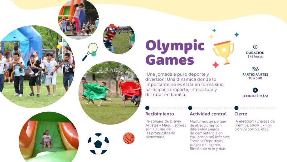 Muchas empresas aprovechan sus instalaciones y el buen clima para festejar el día de la niñez al aire libre. Aprovechamos esta oportunidad para destacarnos con nuestro OLYMPIC GAMES (una competencia en equipos/Familias, cuyo objetivo principal es la integración y diversión de los participantes)