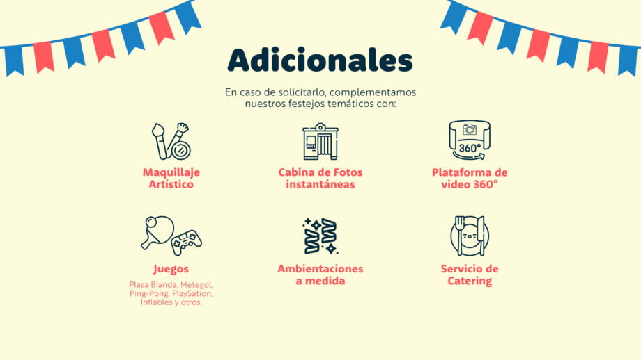 Ambas alternativas son acompañadas de una espectacular ambientación, personajes itinerantes como pueden ser payasos y malabaristas, música, refrigerios y muchas sorpresas más.